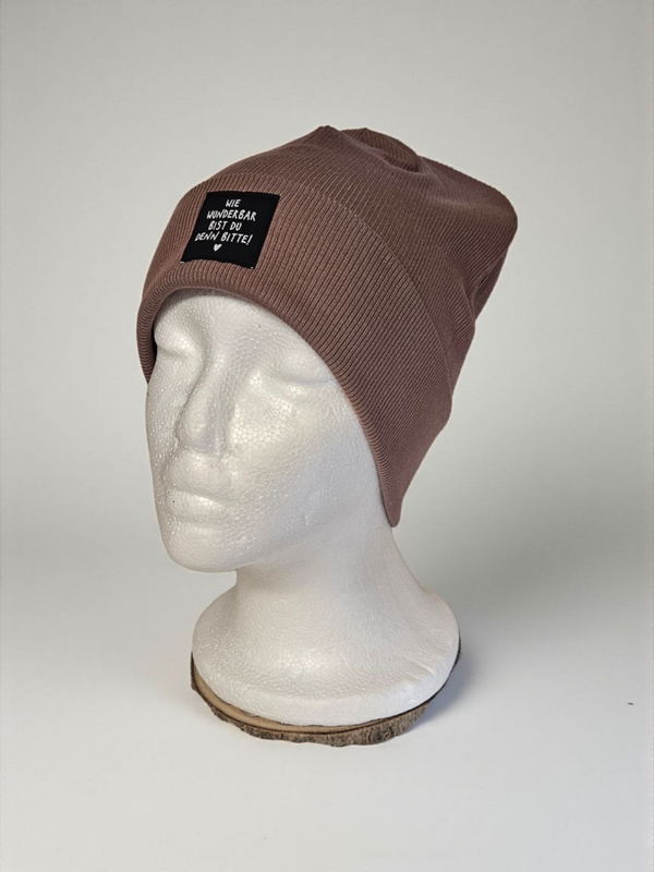 Kinder Beanie – mauve mit textilem Patch "wie wunderbar bist du denn bitte"
