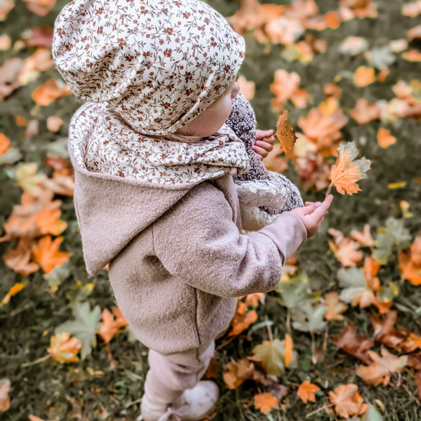 Innen ist der Overall vollständig mit hochwertigem Baumwolljersey „Little Flowers“ gefüttert – ein zartes Blumenmuster, das dem Design eine natürliche, verspielte Note verleiht. Die Zipfelkapuze sorgt nicht nur für zusätzliche Wärme, sondern macht den Look besonders charmant.