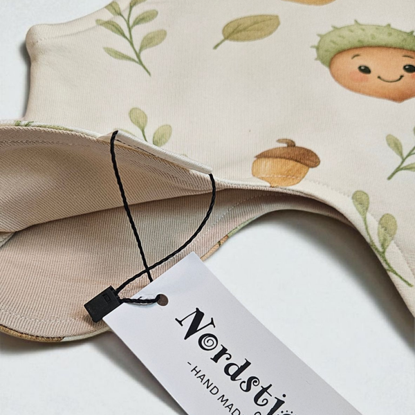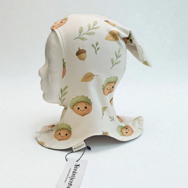 Die Mütze ist doppellagig gearbeitet und besteht aus hochwertigem Baumwolljersey (95% Baumwolle, 5% Elasthan). Innen sorgt ein weicher, unifarbener Stoff in beige für angenehmen Tragekomfort, während außen ein süßer Kastanien Print zu sehen ist.