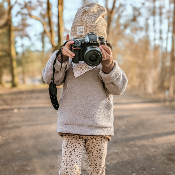 Stylische Beanie Mütze aus weichem Leo-Ribjersey für Kinder und Erwachsene. Das elastische Material sorgt für einen bequemen Sitz und hohen Tragekomfort. Der Patch „Just smile“ macht die Mütze zu einem besonderen Hingucker. Ideal für den Alltag im Frühling, Herbst und Winter.