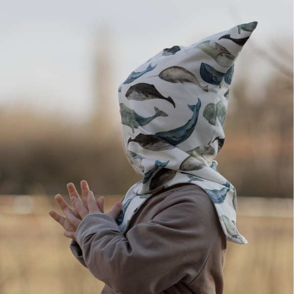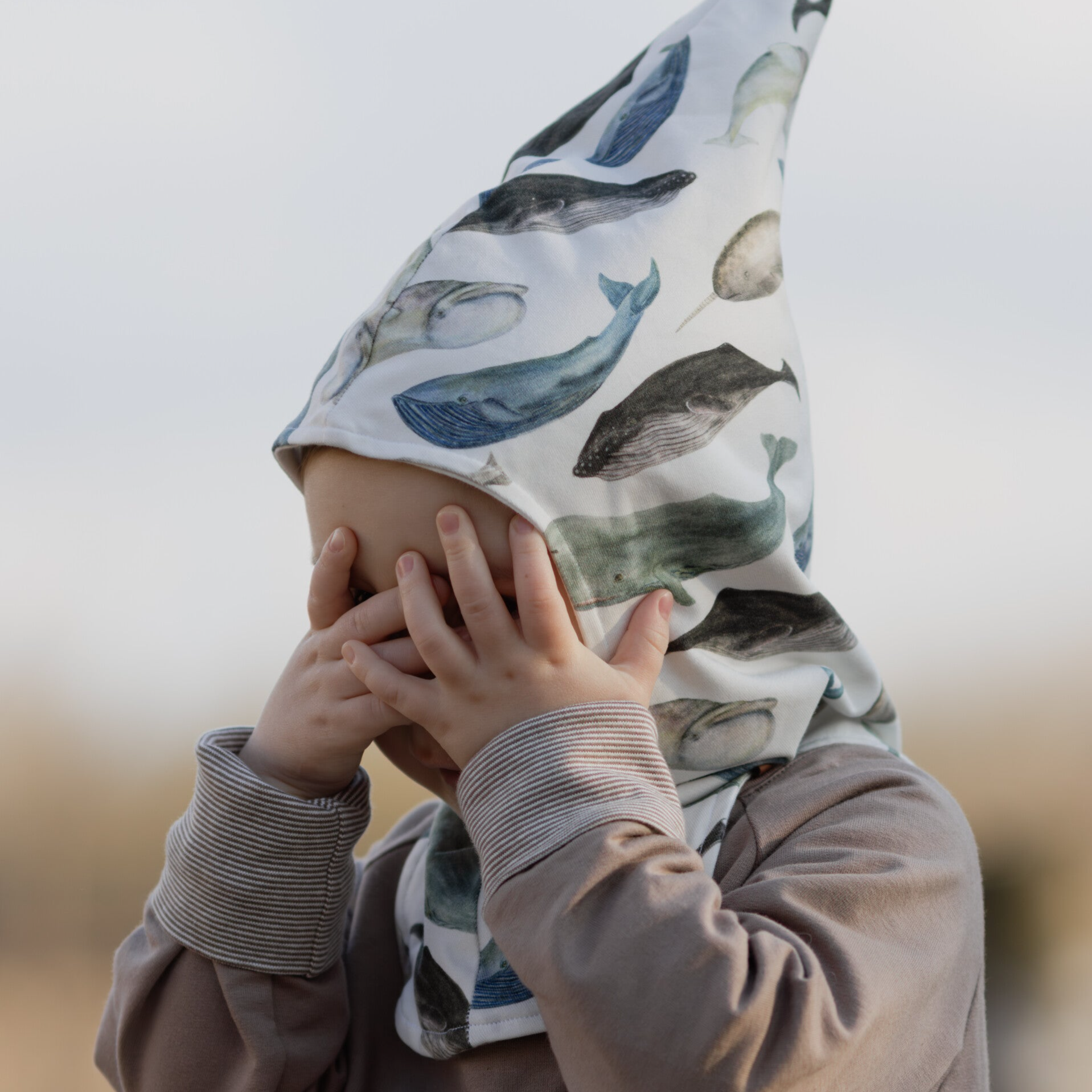 Unsere hochwertige Kinder Schlupfmütze aus Baumwolljersey vereint Komfort, Funktionalität und ein liebevolles Design. Der wunderschöne Walprint auf der Außenseite macht die Mütze zu einem echten Hingucker, während das Innenfutter in uni Offwhite für ein angenehm weiches Tragegefühl sorgt.