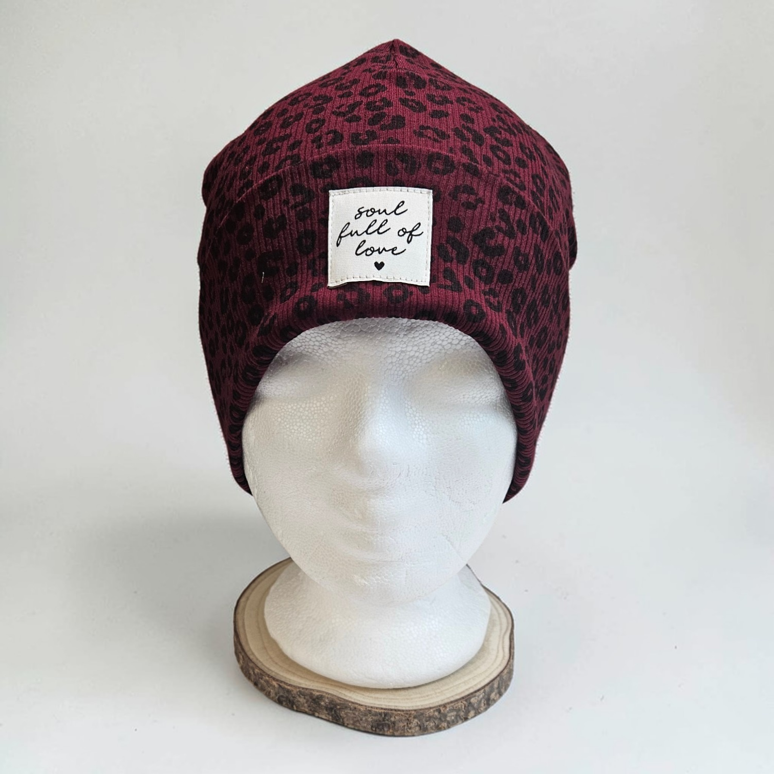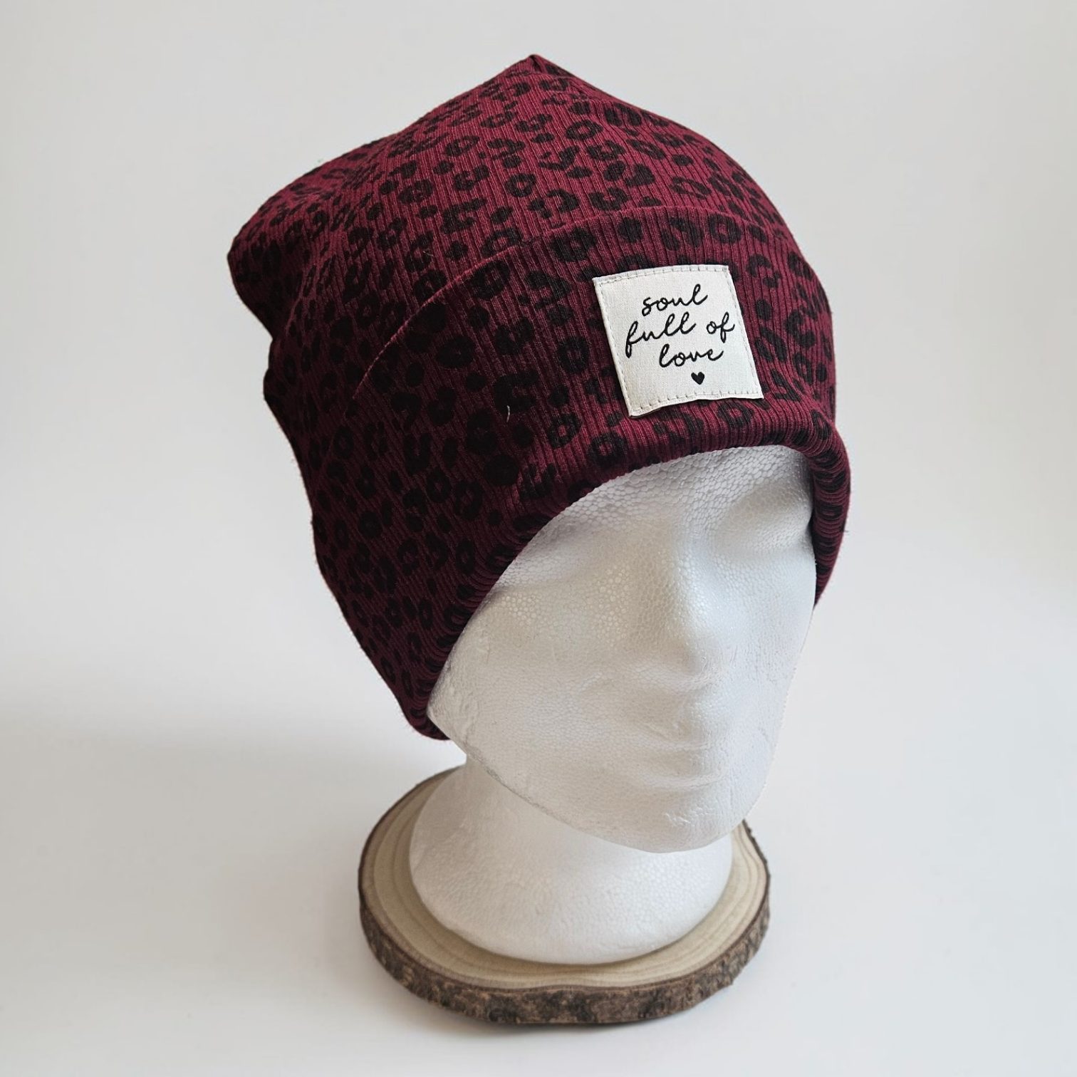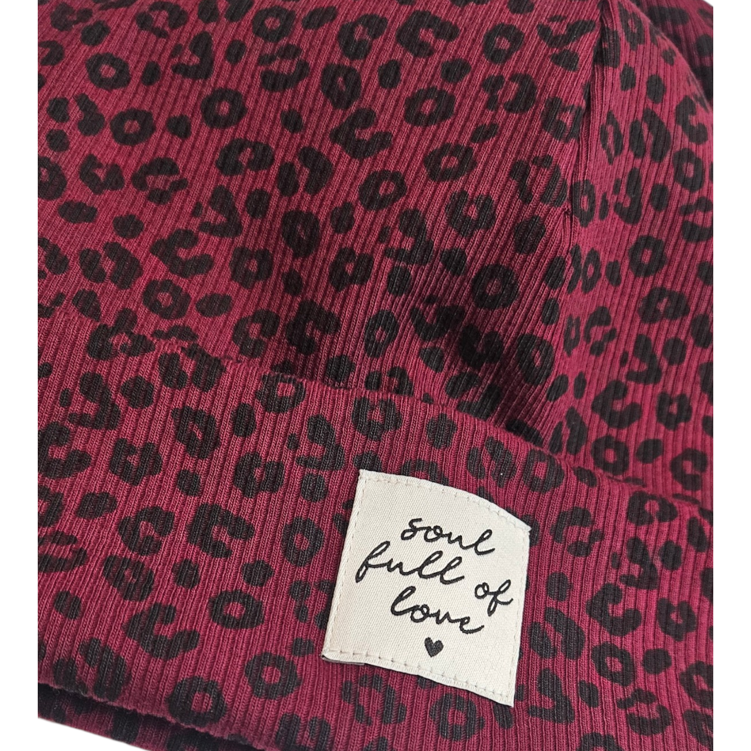 Stylische Beanie Mütze aus weichem Leo-Ribjersey für Kinder und Erwachsene. Das elastische Material sorgt für einen bequemen Sitz und hohen Tragekomfort. Der Patch „Soul full of love“ macht die Mütze zu einem besonderen Hingucker. Ideal für den Alltag im Frühling, Herbst und Winter.