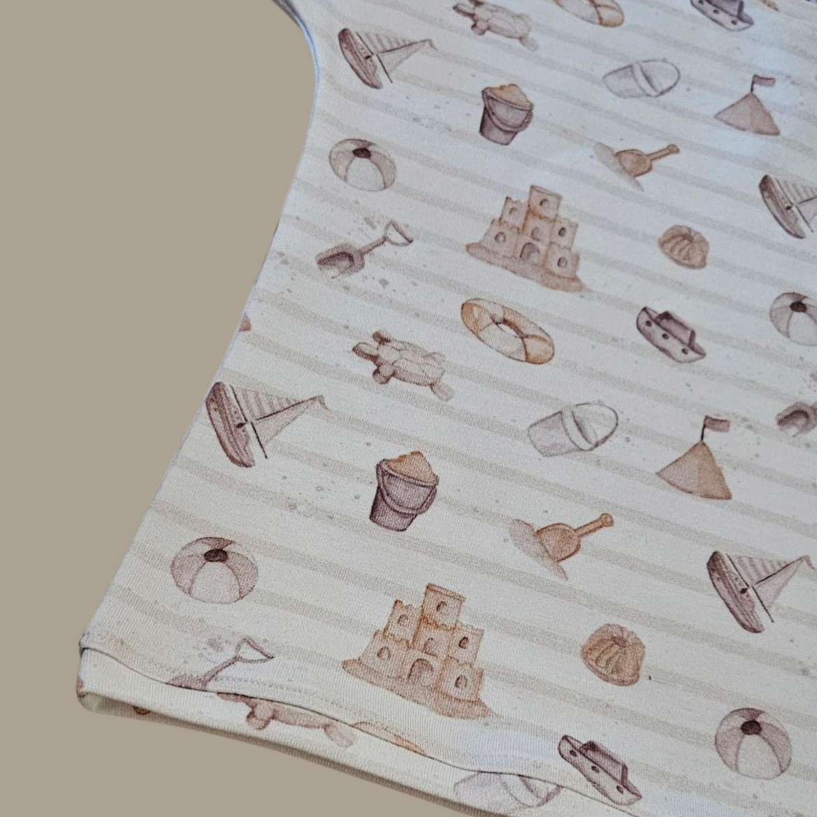Dieses Unisex Kinder T-Shirt mit maritimen Motiven bringt echtes Sommer- und Strandgefühl in die Kindergarderobe. Das liebevolle Design mit kleinen Strandillustrationen wie Sandburgen, Booten, Muscheln und Strandspielzeug macht das Shirt zu einem perfekten Begleiter für sonnige Tage.