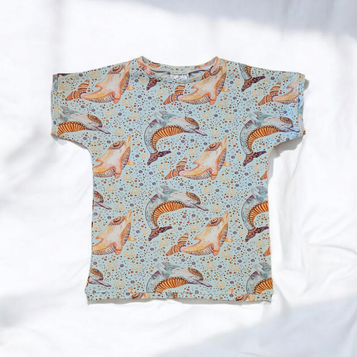 Der bequeme Schnitt sorgt für eine angenehme Passform und lässt sich vielseitig kombinieren – ob mit Shorts, Röcken oder Leggings. Das süße Delfin-Design bringt dabei einen Hauch von Boho- und Meereszauber in jedes Outfit.