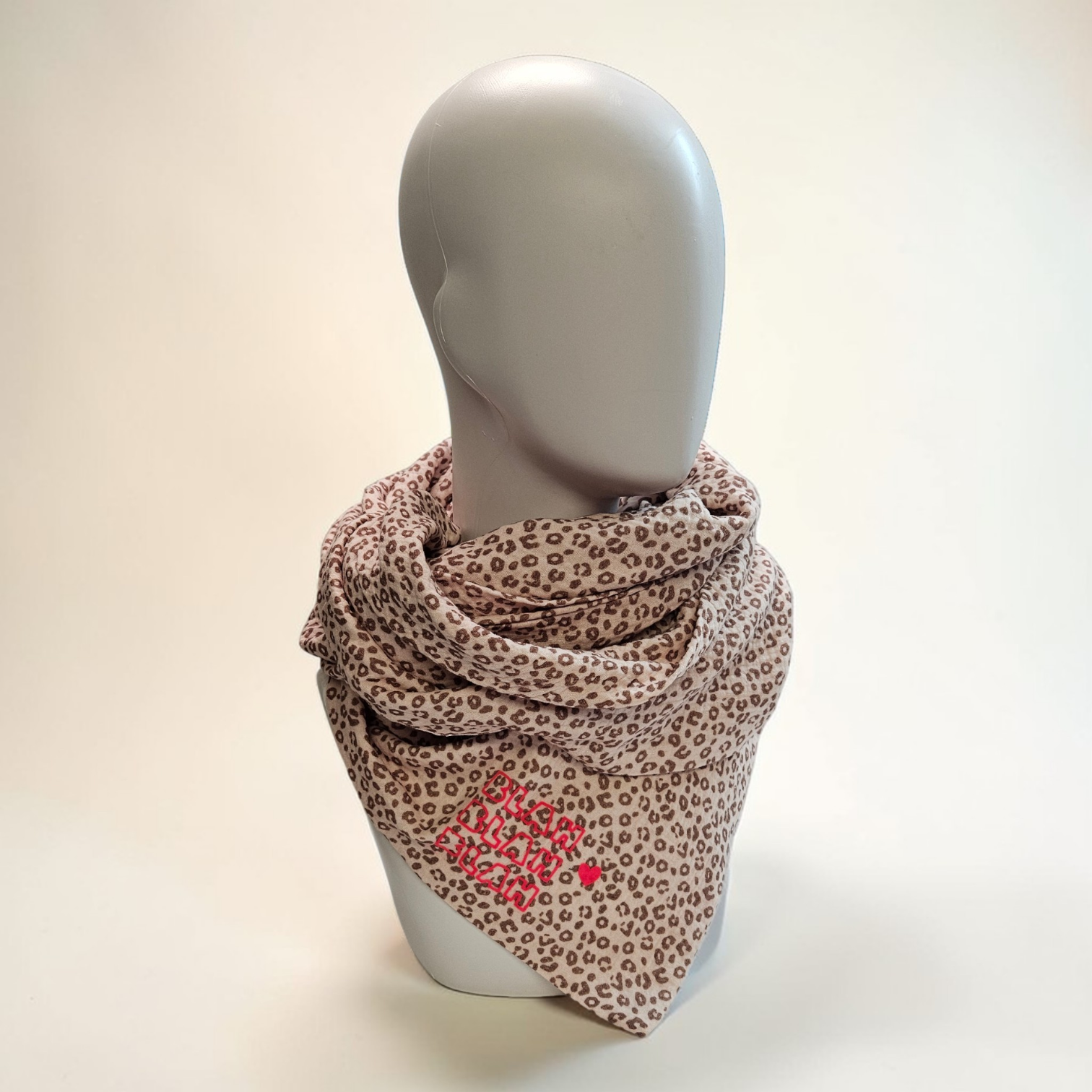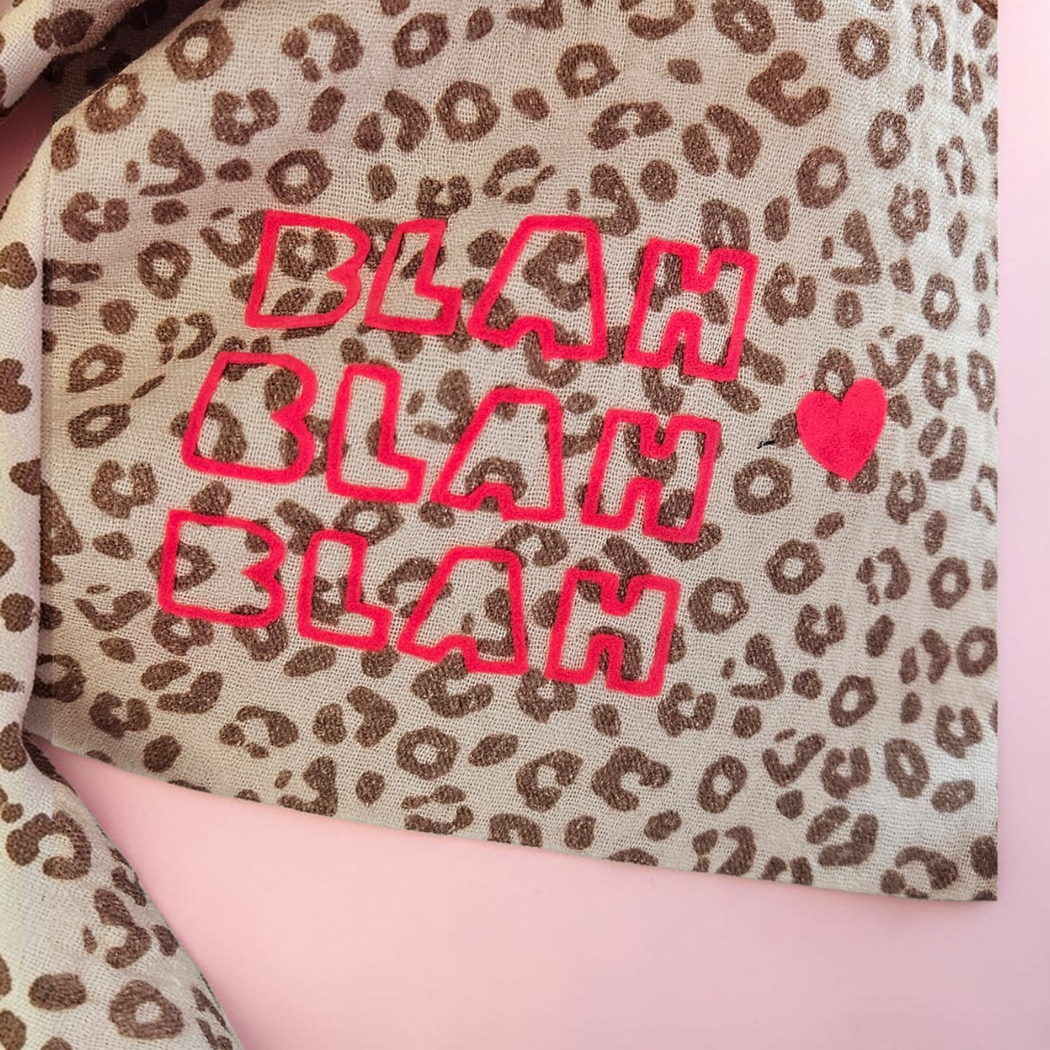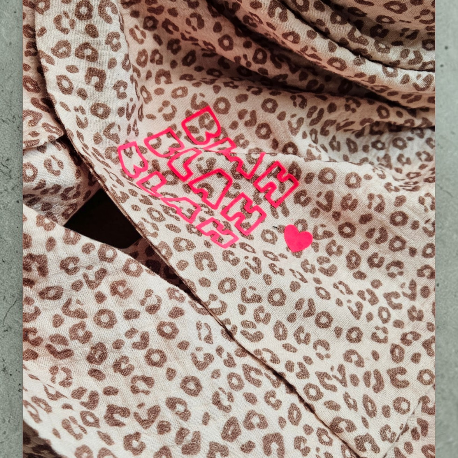 Das moderne Leo-Design verleiht dem Tuch einen trendigen Look, während der pinke Schriftzug „Blah Blah Blah“ mit kleinem Herz für einen verspielten Akzent sorgt.